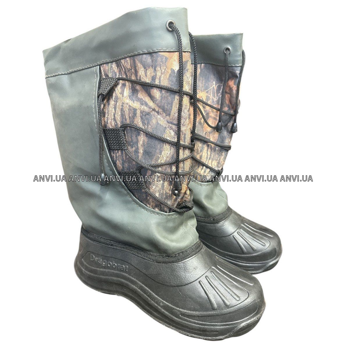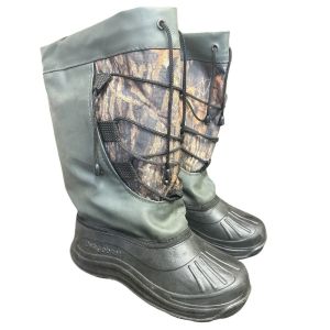 Верх сапог изготовлен из плотного износостойкого ПВХ материала с камуфляжной вставкой, которая повышает практичность и маскировку на природе. Манжета оснащена шнуровкой с фиксаторами, позволяющей плотно затянуть голенище и защитить ногу от попадания снега, воды и холодного воздуха.